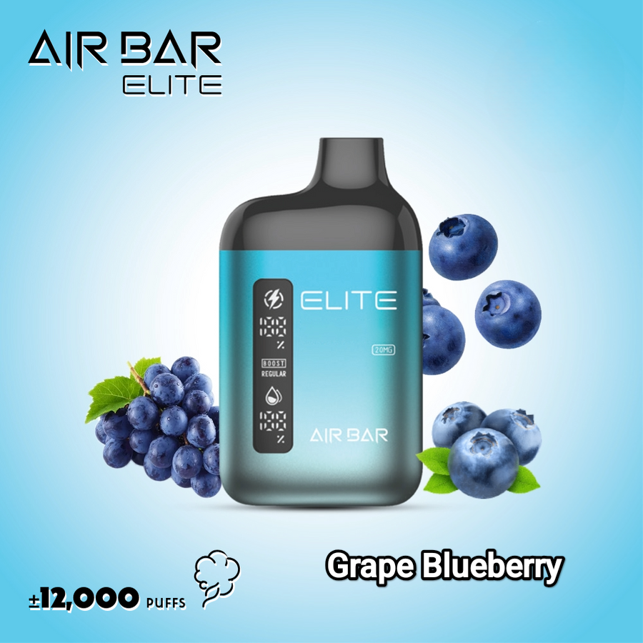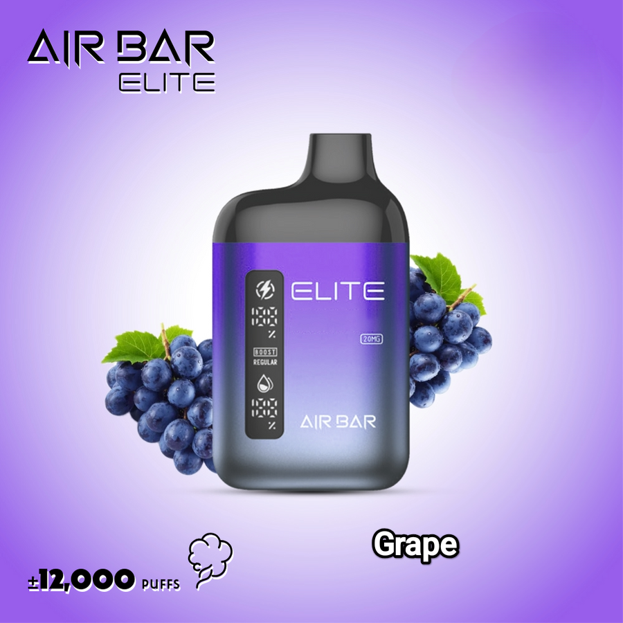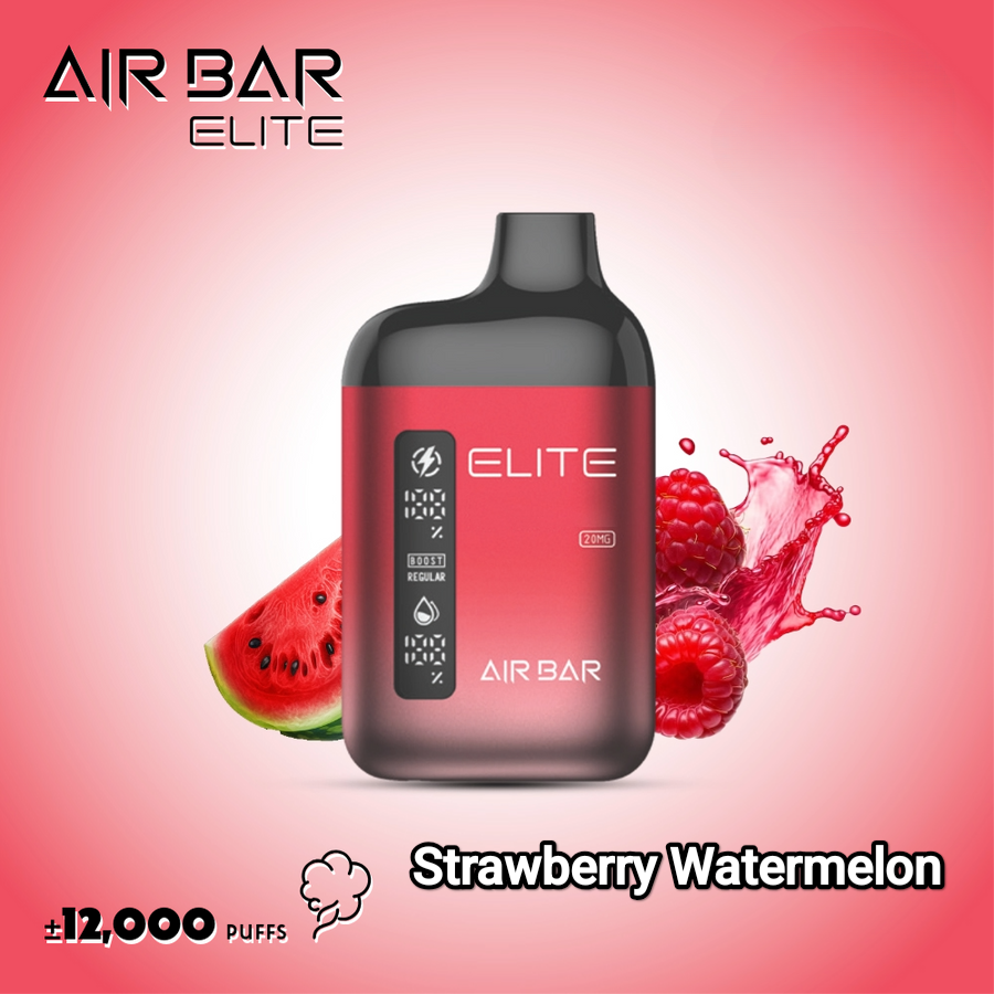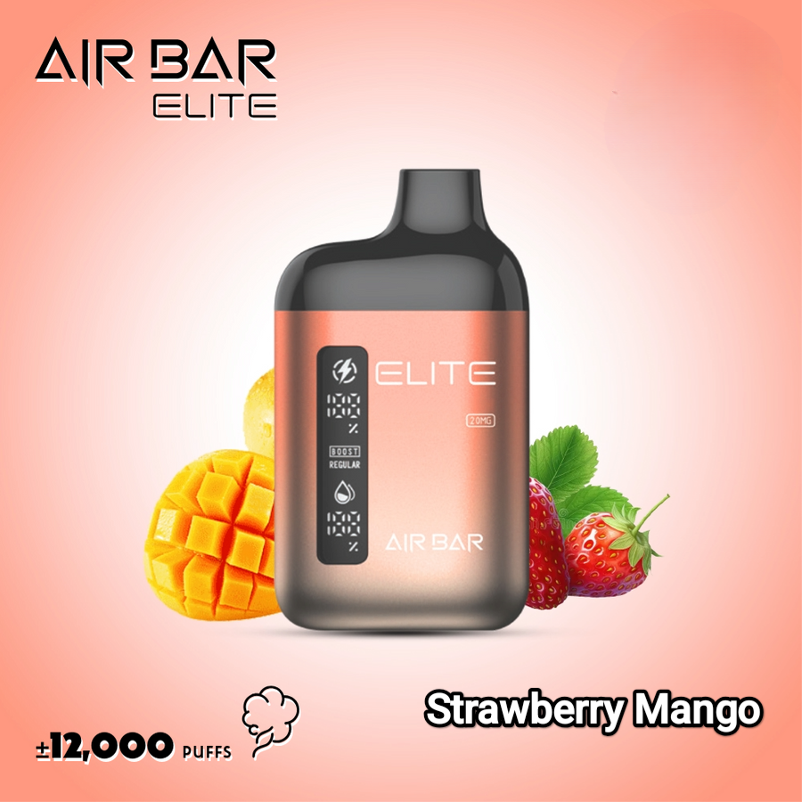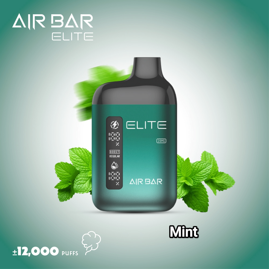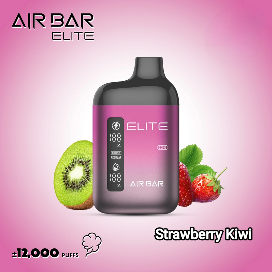 The Air Bar ELITE disposable vape with ±12,000 puffs and 20MG nicotine. Features a smart screen with battery/liquid indicators and selectable BOOST/REGULAR modes. Choose your flavor below.