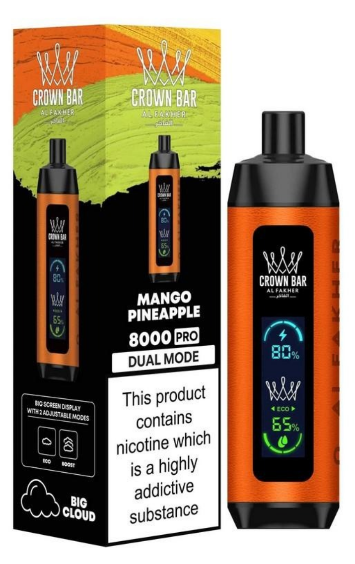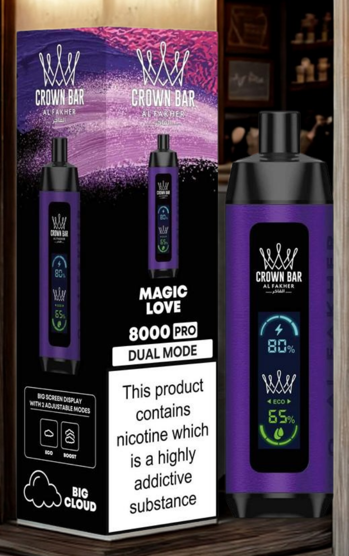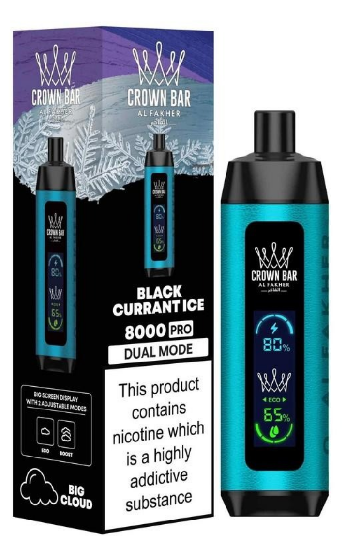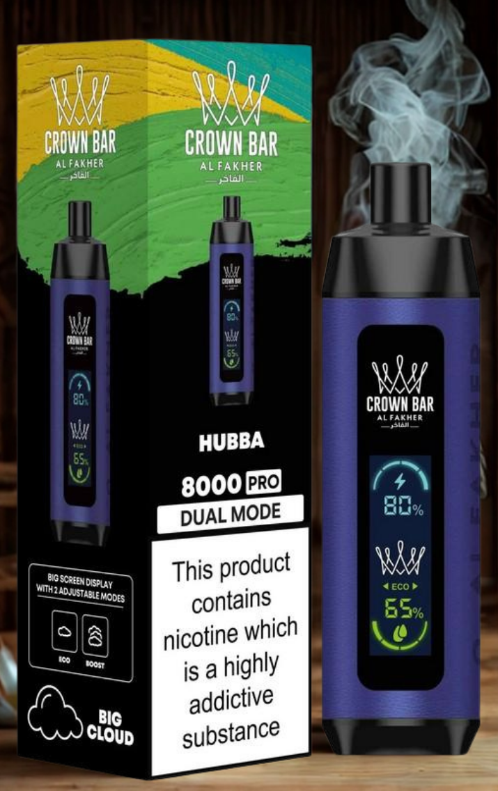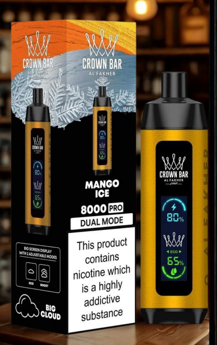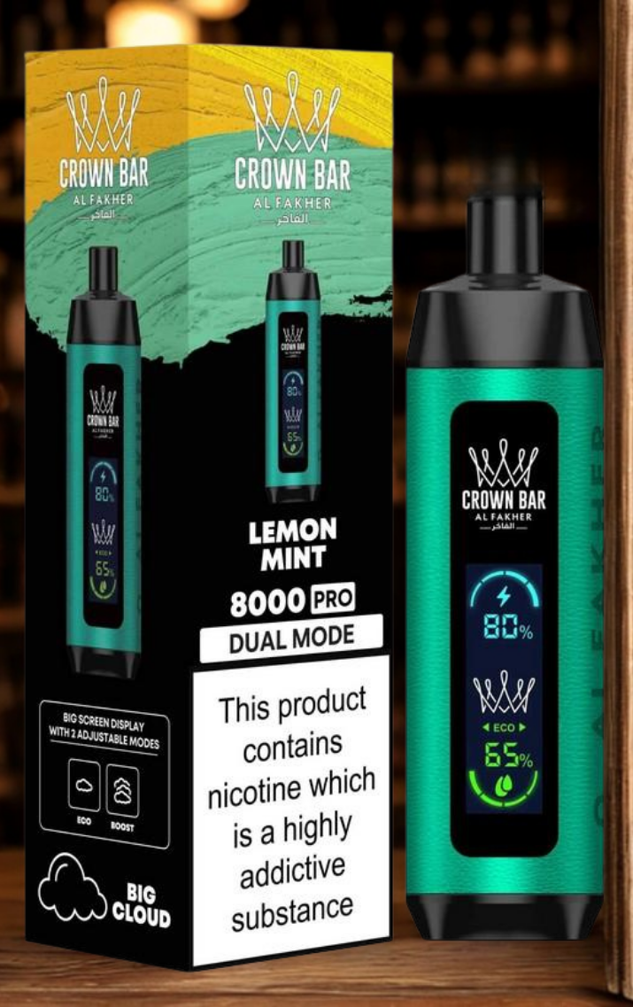 Experience the Al Fakher Crown Bar 8000 Pro. This ±8,000 puff disposable features a Big Screen Display for battery and e-liquid, plus Dual Mode (ECO/BOOST) for a customizable, big cloud vape. Select your favorite Al Fakher shisha flavor below.