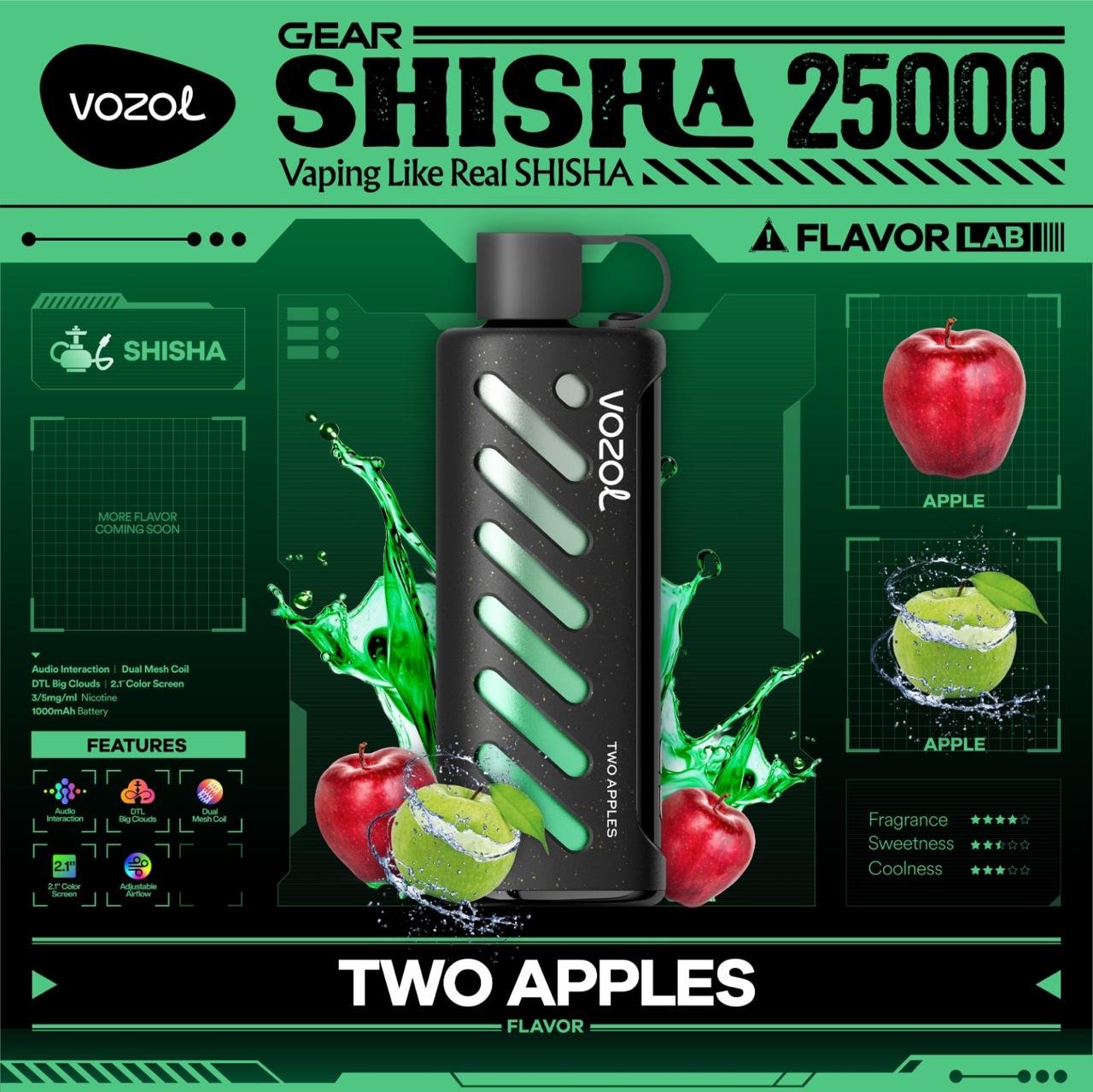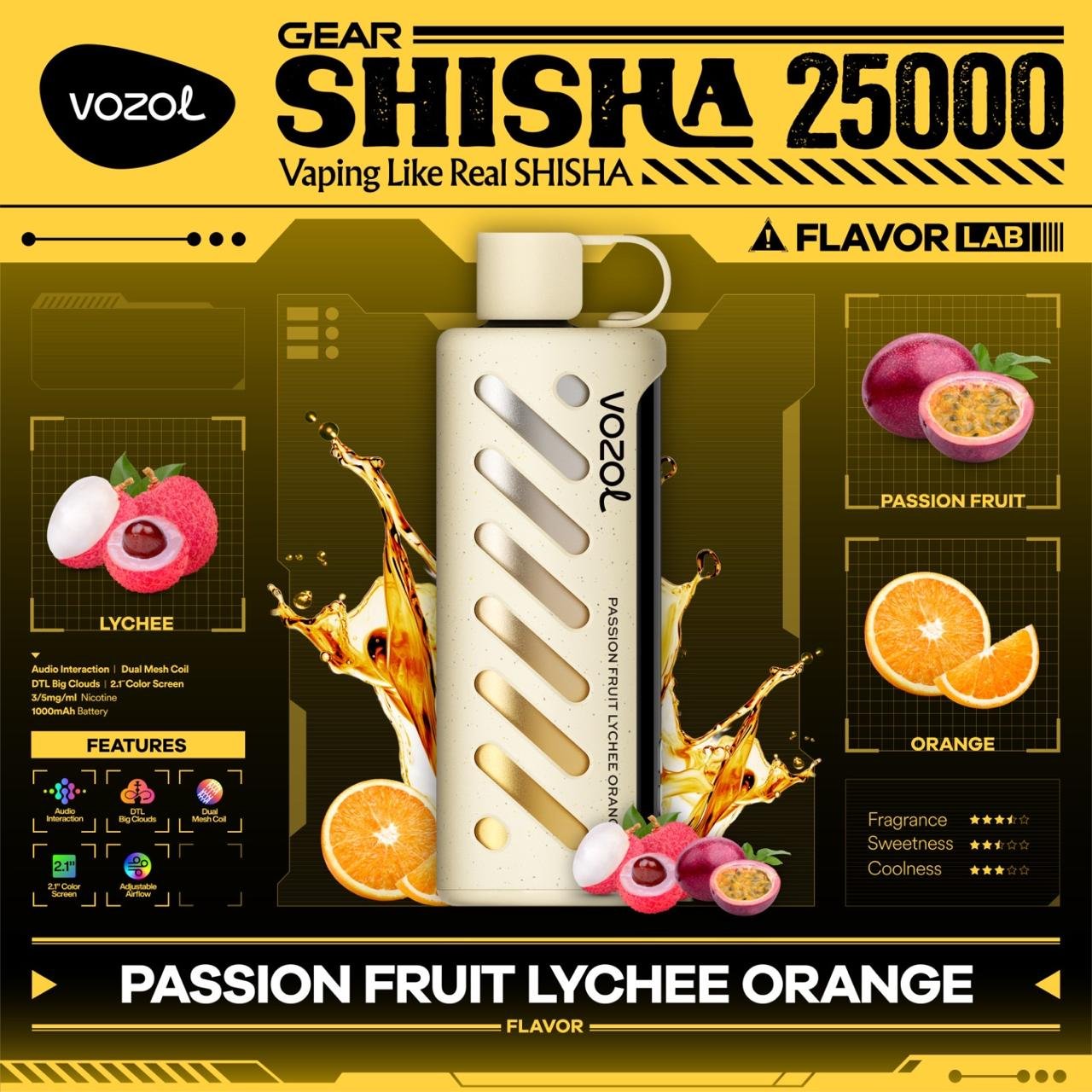 Experience the smooth, rich tradition of hookah translated into a powerful disposable vape. The **VOZOL Gear Shisha 25000** is engineered with a **Dual Mesh Coil** to deliver authentic, dense clouds suitable for **DTL (Direct-to-Lung)** vaping. It features a massive 1000mAh rechargeable battery and a large 2.1-inch color screen.